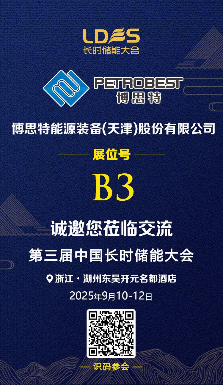 The China Long-Duration Energy Storage Conference is a professional offline conference in China that focuses on the application and development of various long-duration energy storage technologies. This year's conference will be held from September 10th to 12th at the Dongwu Kaiyuan Mingdu Hotel in Huzhou, Zhejiang Province. Recently, Best Energy Equipment (Tianjin) Co., Ltd. (hereinafter referred to as "Best Energy"), a national-level manufacturing single-product champion enterprise specializing in energy solutions, will showcase its core products, including compressed air energy storage cyclone separators, dechlorination devices, and high-temperature, high-pressure, large-diameter key control valves, at the exhibition. We sincerely invite you to attend, provide guidance, and discuss cooperation.